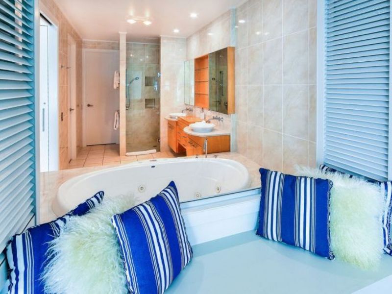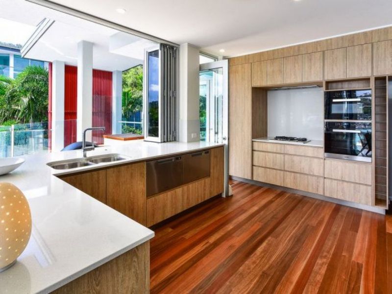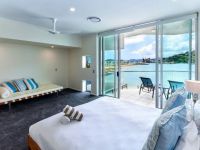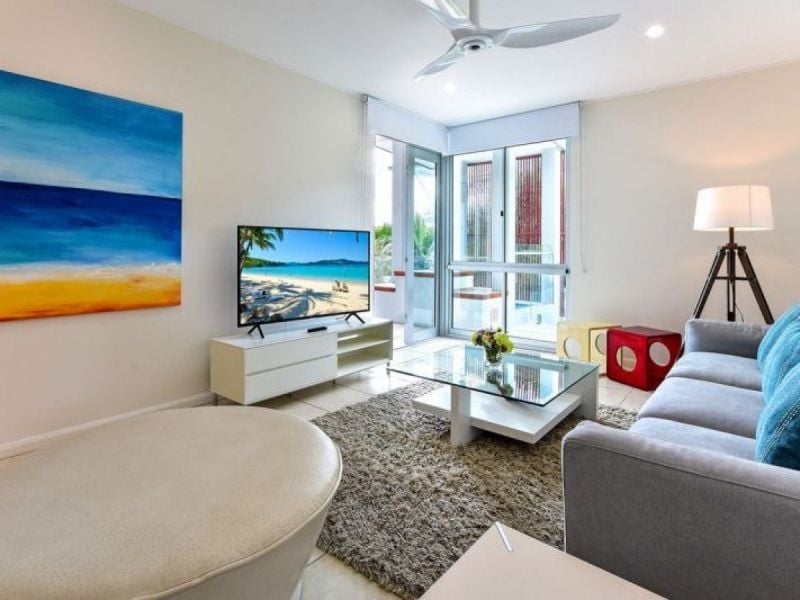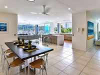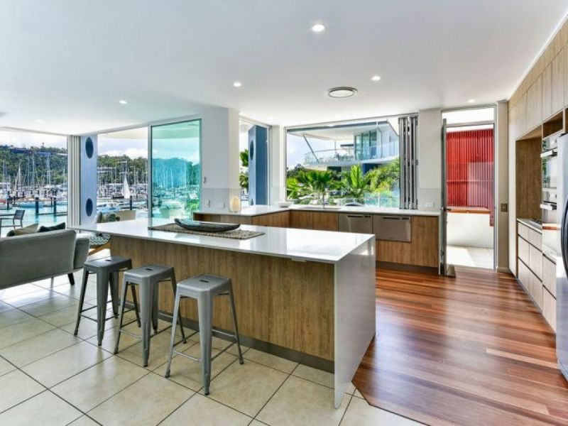 Clean lines and modern design, the recently renovated gourmet kitchen adjoins an open plan dining and living area, providing the ultimate setting for entertaining friends and family in your island holiday home. Framed by concertina doors, the kitchen and living room open, almost seamlessly, to the expansive wrap-around balcony overlooking the world-class Hamilton Island Marina.